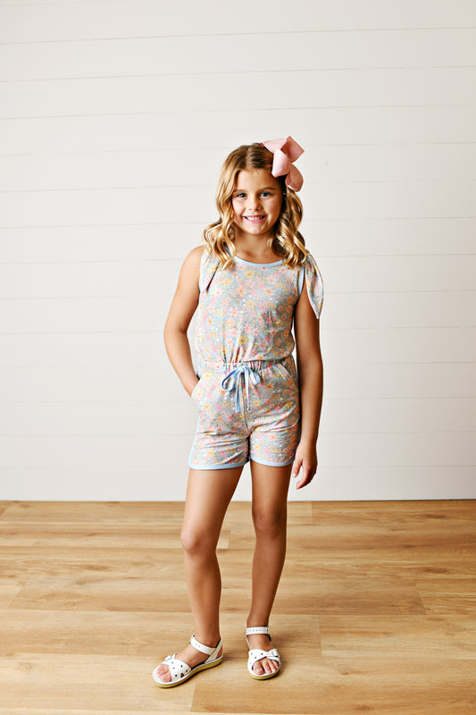 Girls Blue & Pink Floral Tie Shoulder Romper | Bossier City, LA