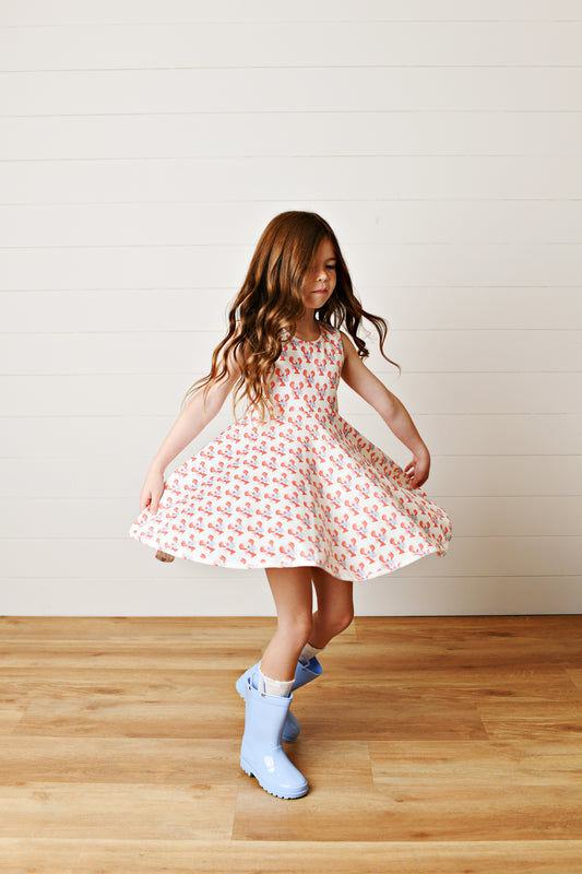 Girls White & Red Crawfish Twirl Dress with Blue Bow | Bossier City, LA
