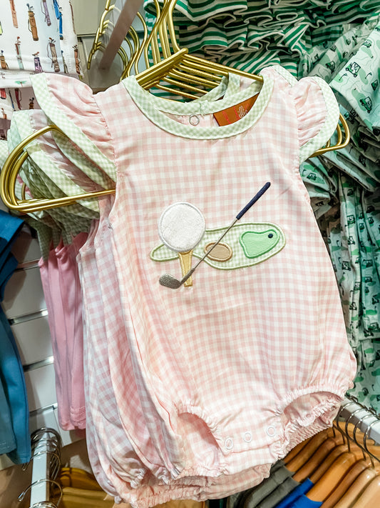 Baby Girls Pink Gingham Golf Appliqué Bubble | Southern Boutique Baby Outfit – Bossier City Louisiana