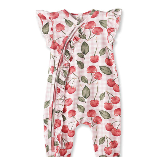 Cherry Picnic Baby Girl Romper – Soft Bamboo Zipper Pajamas