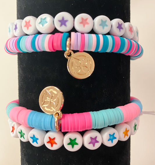 Kids Set of 2, Multi Rubber Disk with Star Beaded Bracelet
