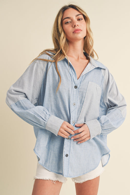 Light Blue Striped Textured Puff Sleeve Maternity Top