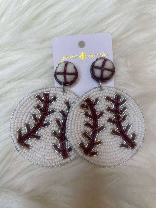 Maroon Beaded Baseball Earrings