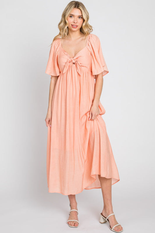 Peach Front Tie Ruffle Sleeve Maternity Midi Dress