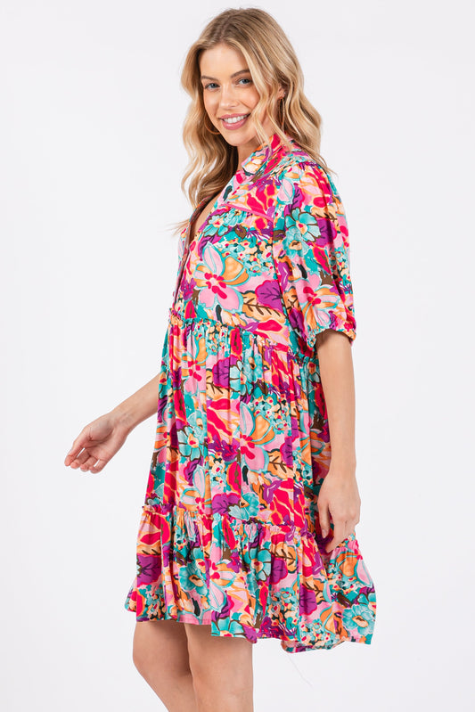 Pink Floral Button Puff Sleeve Maternity Midi Dress