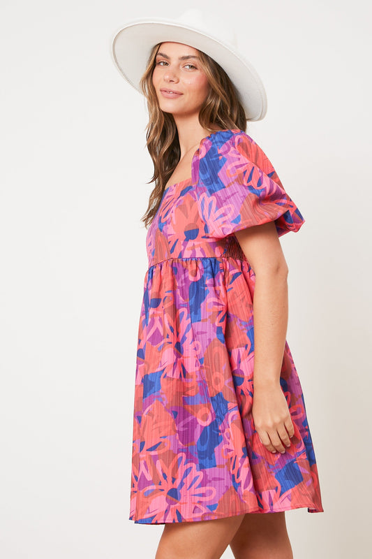 Pink Floral Square Neck Puff Sleeve Dress