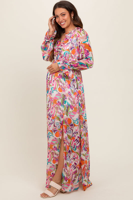 Pink Print Ruffle Long Sleeve Maternity Maxi Dress
