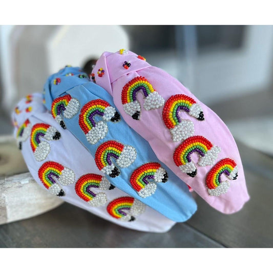 Rainbow Pencil Seed Beaded Hearts Top Knot Headband