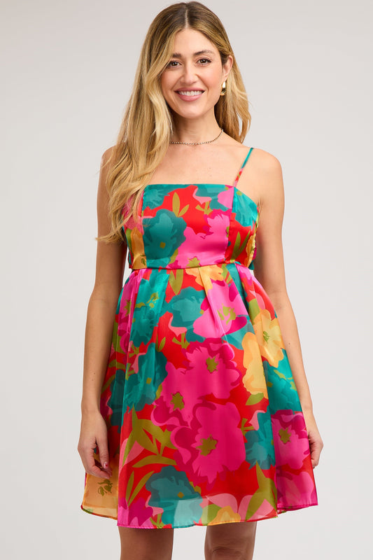 Red Floral Organza Square Neck Back Tie Maternity Dress