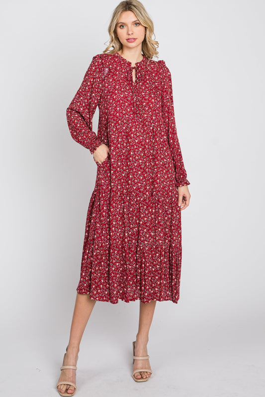Red Floral Tiered Long Sleeve Midi Dress