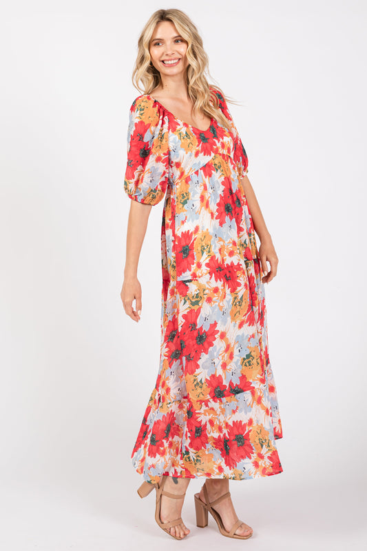 Red Floral V-Neck Short Puff Sleeve Tiered Midi Dress