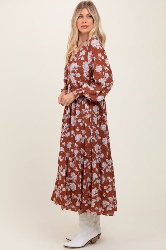 Rust Floral Textured Bubble Sleeve Maxi Dress
