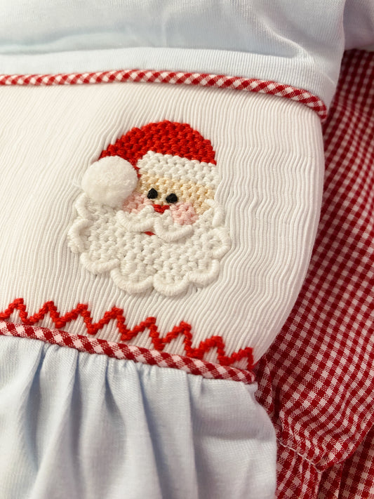 Santa Smocked Boys Pant Set – Blue Shirt & Red Gingham Christmas Outfit