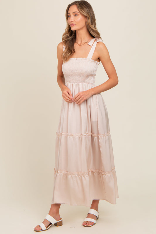 Beige Satin Smocked Maxi Dress