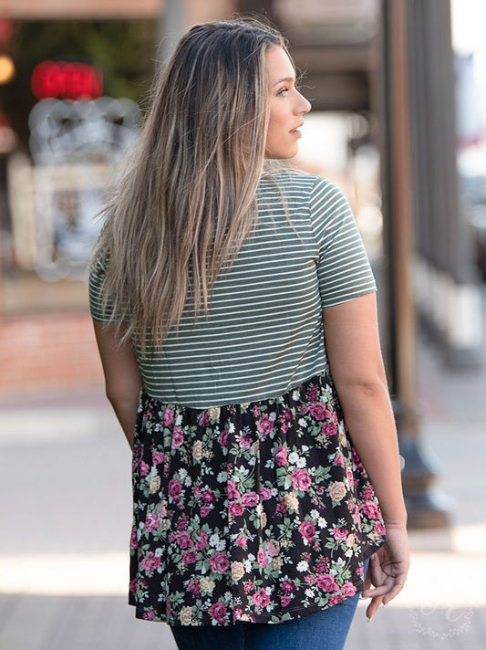 Show Me the World Top with Floral Back & Lace Accent