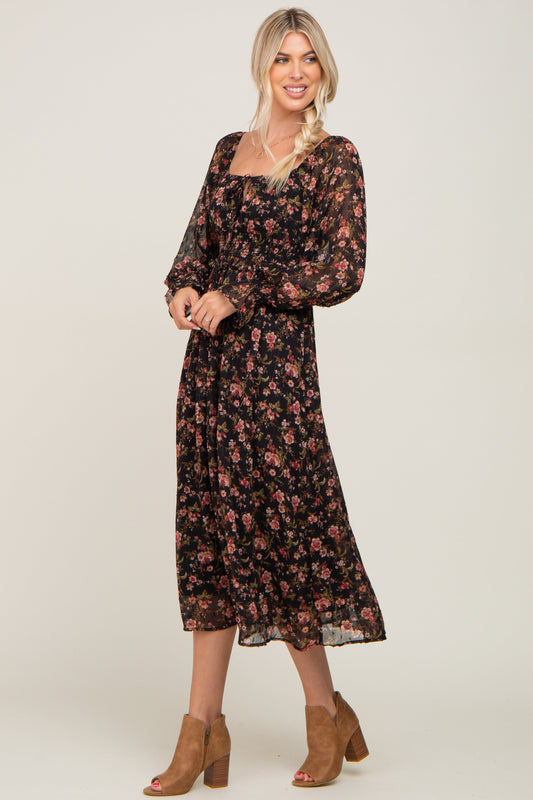 Black Floral Chiffon Deep V Ruffle Tiered Maxi Dress