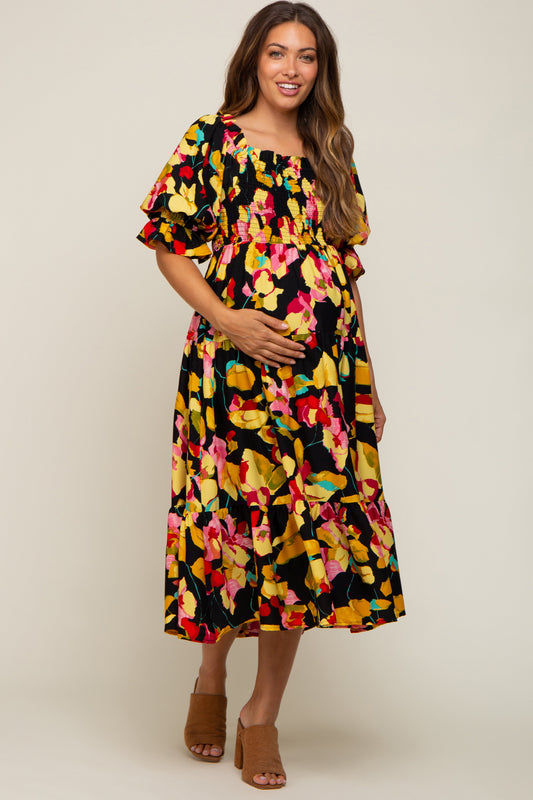 Black Floral Print Smocked Ruffle Hem Maternity Midi Dress