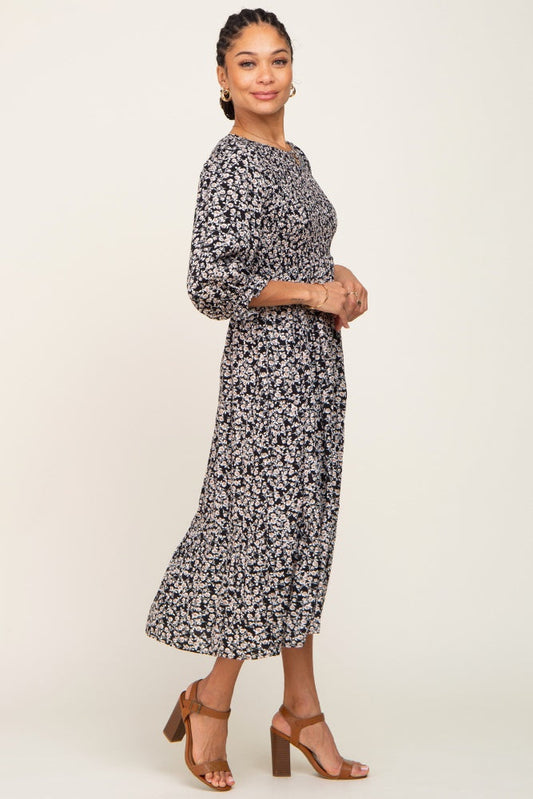 Black Floral Smocked 3/4 Sleeve Midi Dress