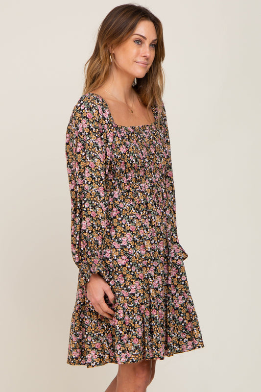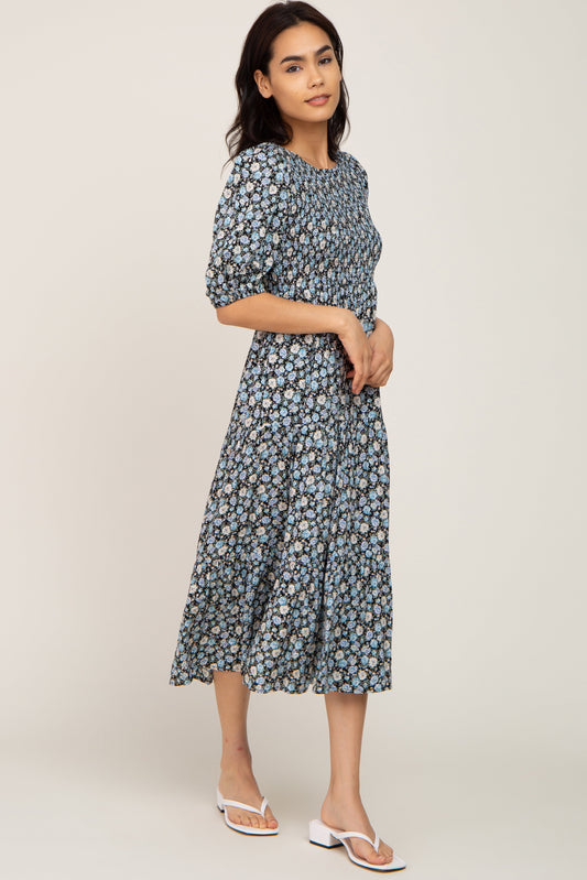 Black Floral Smocked Shoulder Tie Maternity Midi Dress