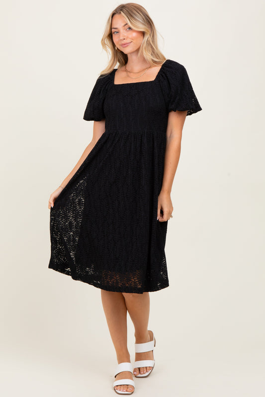 Black Lace Overlay Long Sleeve Fitted Maternity Midi Dress