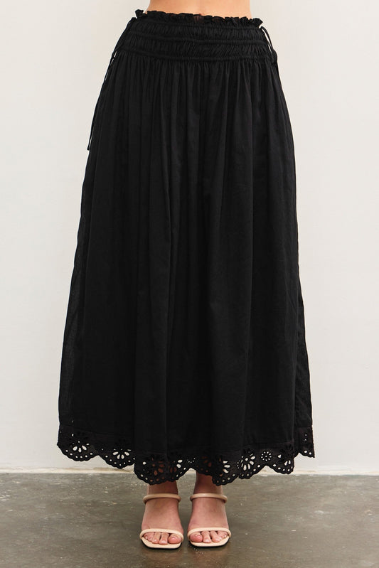 Black Smocked Waist Eyelet Lace Hem Maxi Skirt