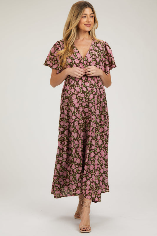 Brown Floral Smocked Waist Maternity Maxi Dress