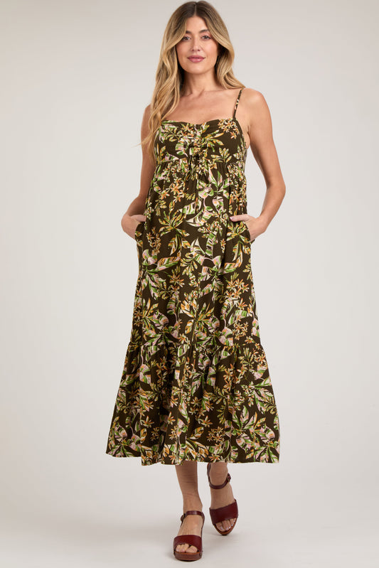 Brown Floral Sleeveless Front Cinched Maternity Midi Dress