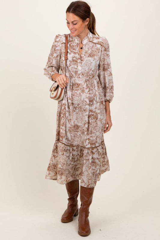 Brown Printed Split Ruffle Collar Maternity Midi Dress