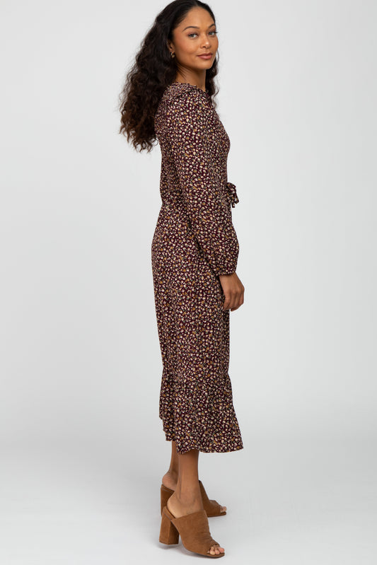 Burgundy Floral Collared Tiered Maternity Midi Dress