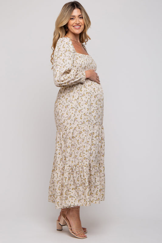 Cream Floral Smocked Long Sleeve Maternity Maxi Dress