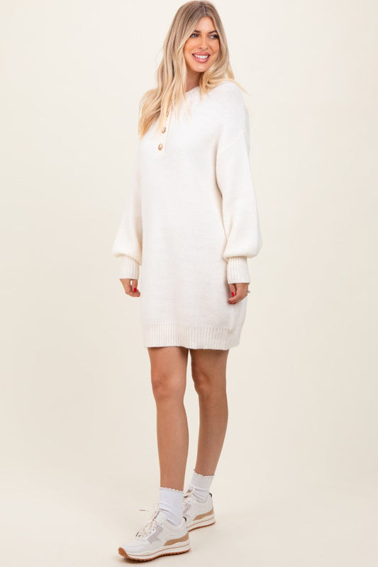 Cream Fuzzy Knit Turtleneck Maternity Sweater Mini Dress