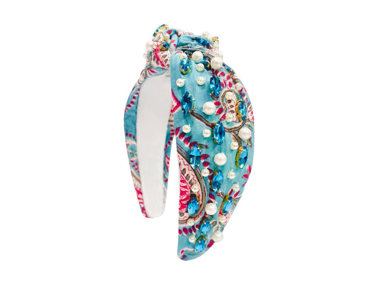 Floral Print Headband - Blue Rhinestone Pink Paisley