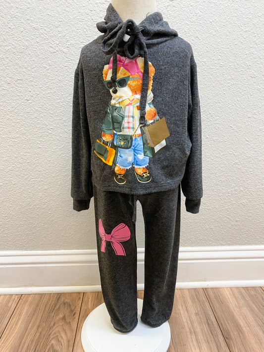 Girls Charcoal Teddy Bear Hoodie & Bow Jogger Set