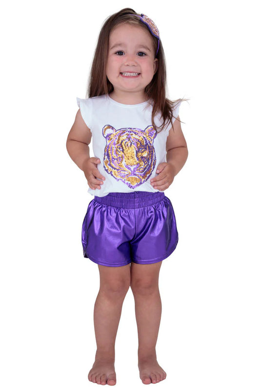 Purple Gold Sequin Tiger White Ruffle Sleeve