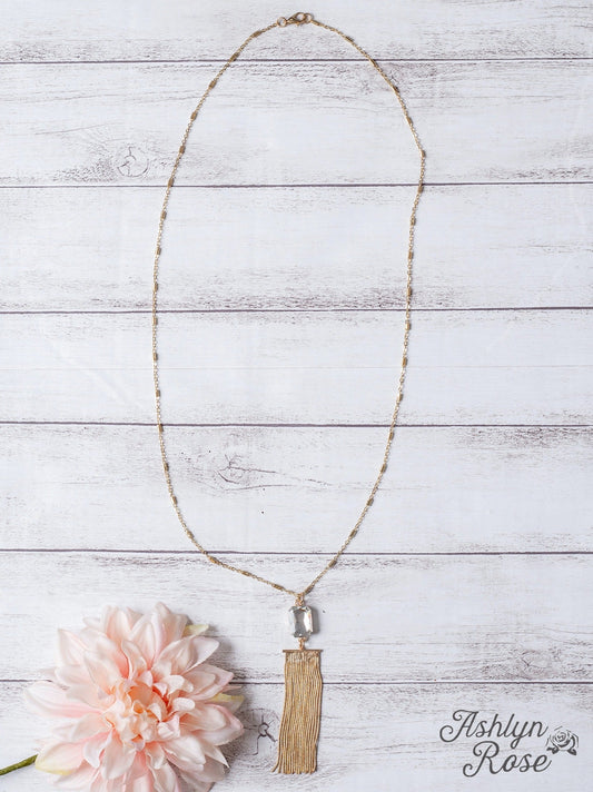 CATCH THE LIGHT SQUARE CRYSTAL GOLD FRINGE PENDANT ON A GOLD CHAIN NECKLACE