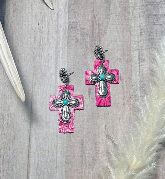 KICK ROCKS COWBOY TURQUOISE CONCHO WITH PINK AND TAN TASSELS DANGLE EARRINGS