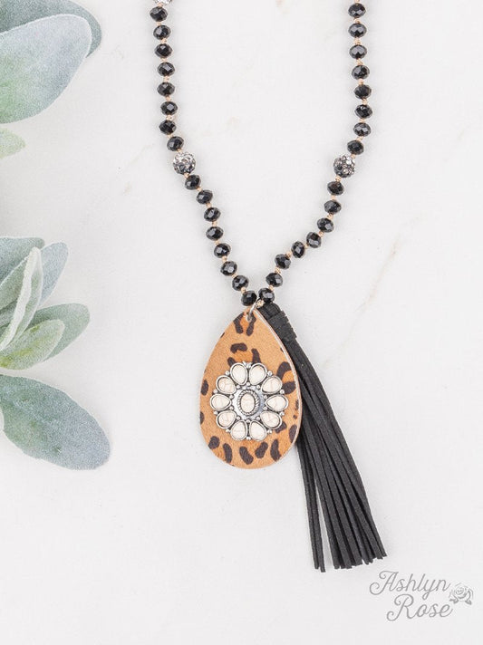 Leopard Glam Beaded Necklace with Leopard Pendant & Black Leather Tassel