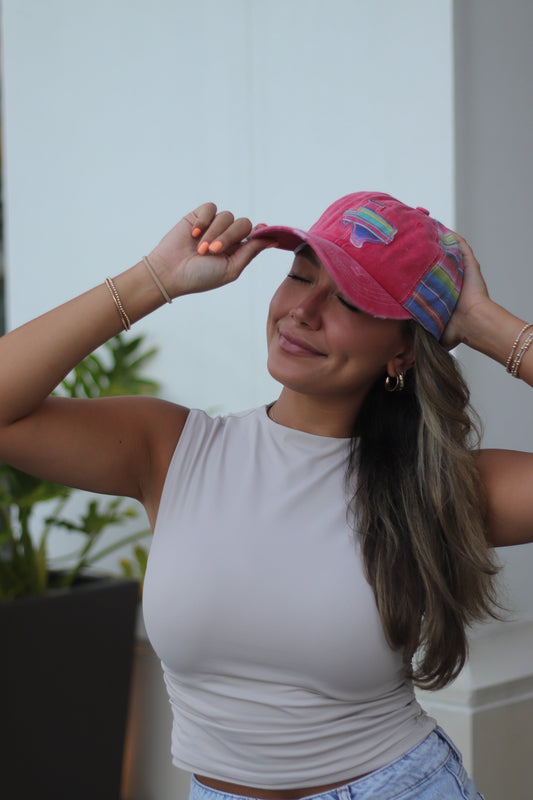 Embroidered Serape Texas on Bright Red Hat with Serape Fabric