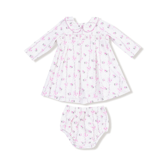 Dainty Buds and Bows Stripe - Long Sleeve Peter Pan Collar Dress with Smocking and Bloomer