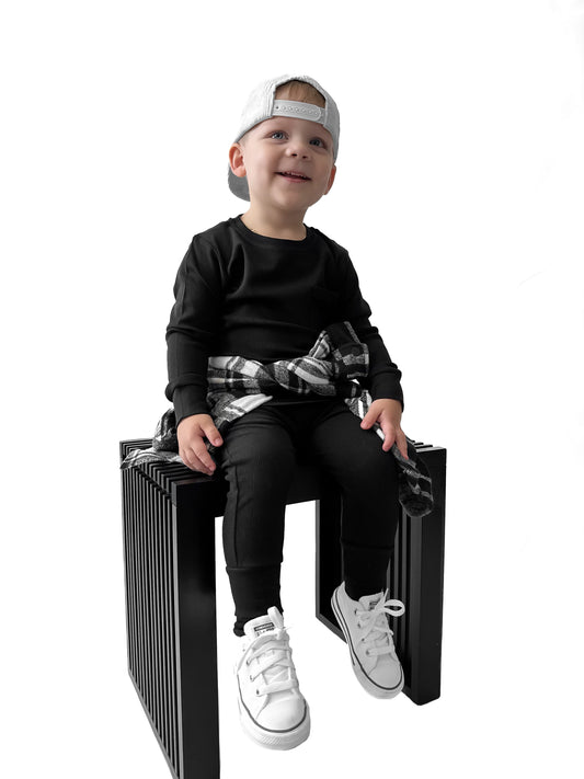 BAMBOO RIBBED LONG SLEEVE POCKET TEE - BLACK