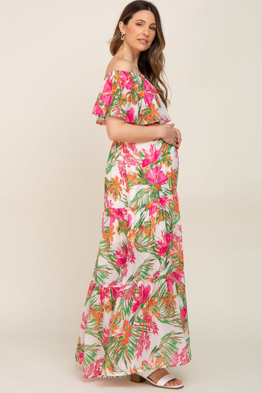 Ivory Tropical Print Off Shoulder Maternity Maxi Dress