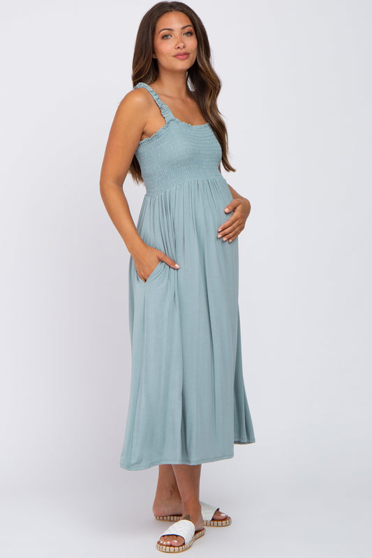 Light Blue Smocked Ruffle Strap Maternity Midi Dress