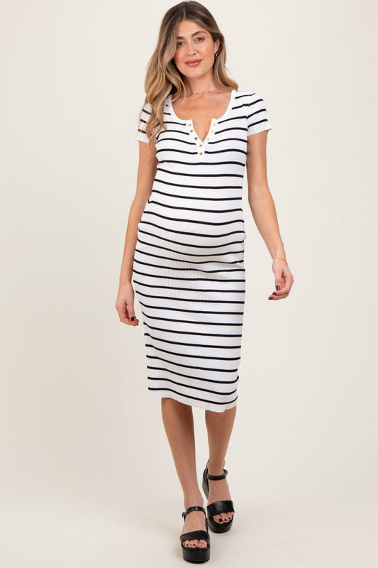 White Striped Ribbed Henley Fitted Maternity Midi Dress