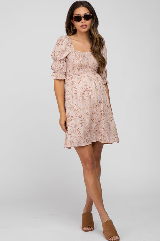 Pink Floral Smocked Square Neck Puff Sleeve Maternity Dress