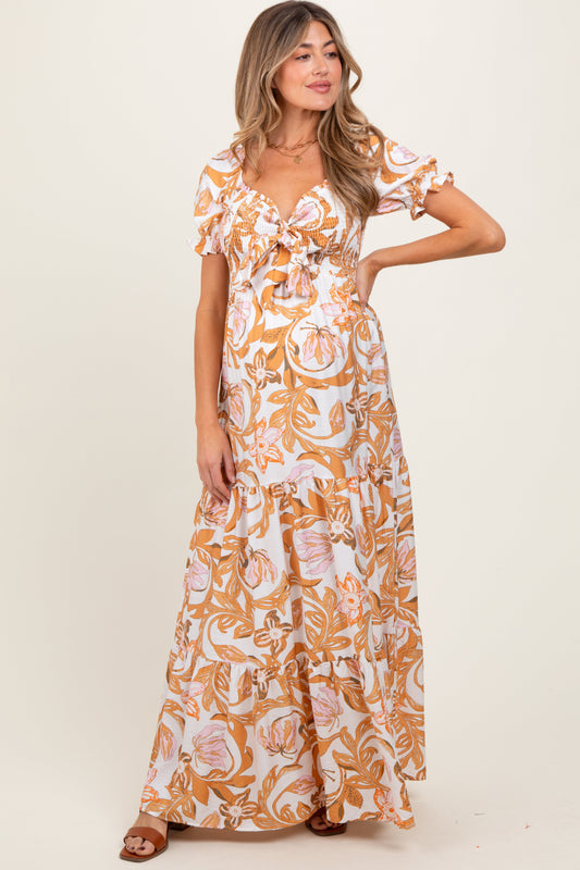 Taupe Floral Smocked Front Tie Maternity Maxi Dress