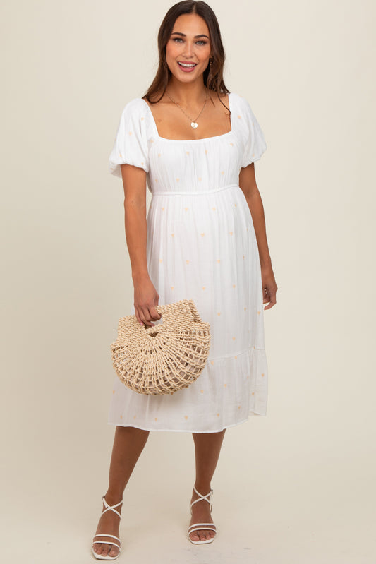 White Heart Embroidered Short Puff Sleeve Maternity Midi Dress