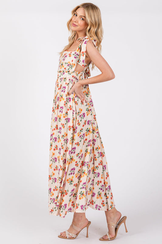 Light Olive Floral Sweetheart Smocked Front Cutout Maxi Dress