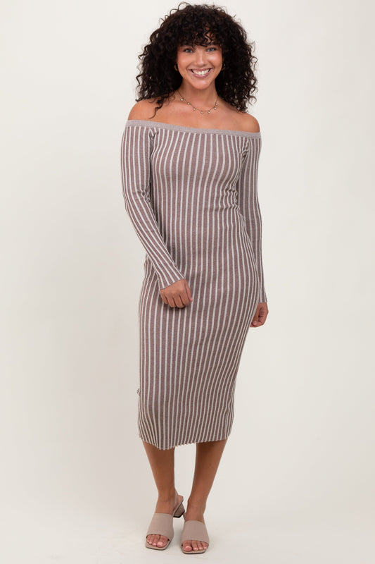 Taupe Striped Off Shoulder Midi Sweater Dress