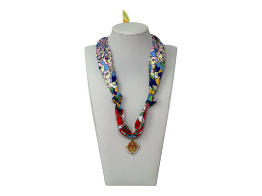 Scarf Charm Necklace - Blue Multi Flower with Mary Pendant with Pearls
