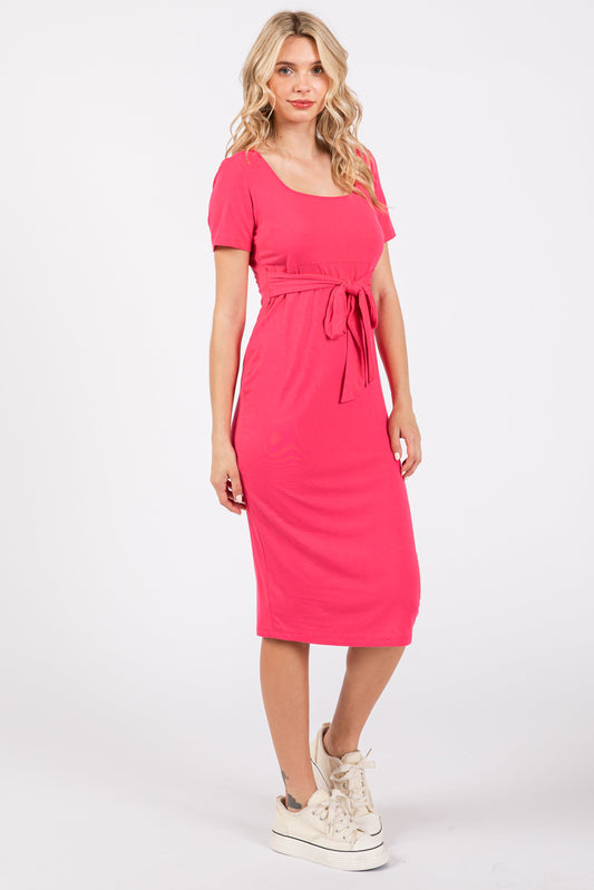 Coral Square Neck Belted Midi Dress